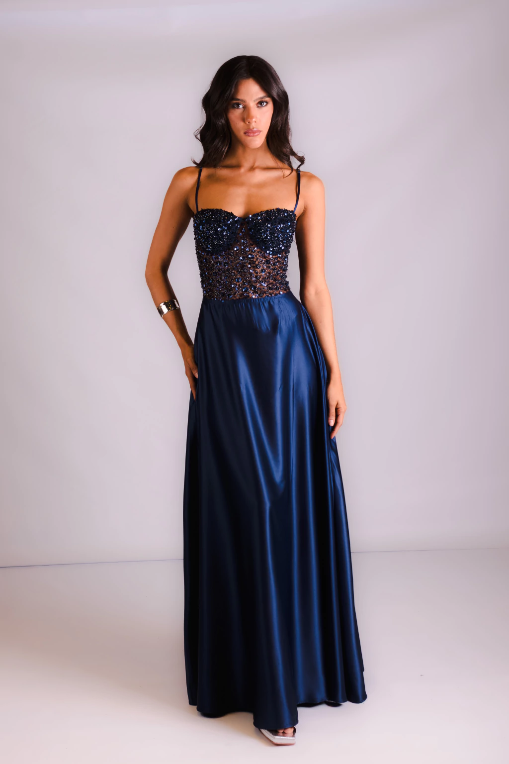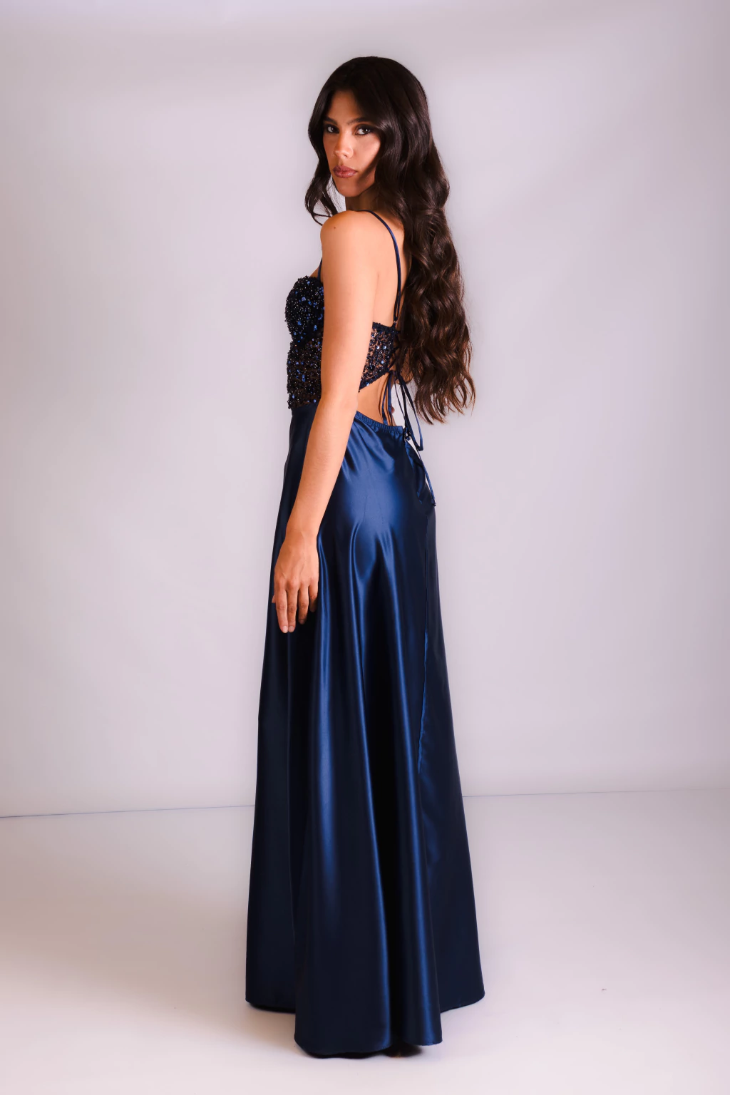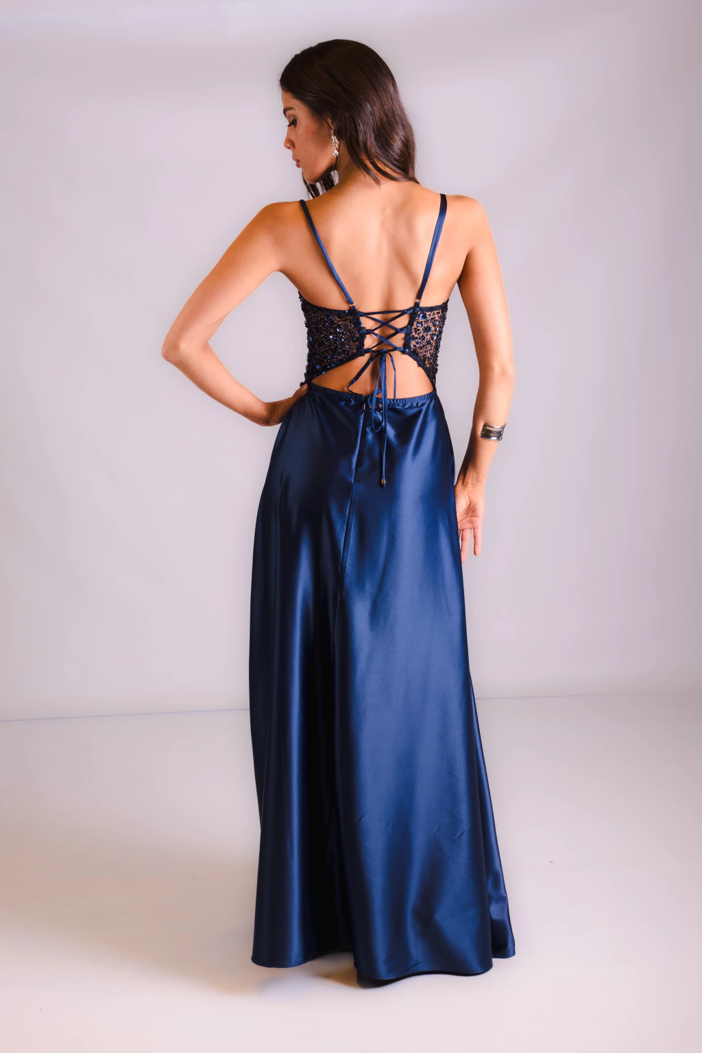 Deslumbrá con el encanto del Vestido Parissea. Corset bordado con cristales y lentejuelas, falda de satén con caída fluida y espalda descubierta con tiras cruzadas. Un diseño elegante y seductor que roba todas las miradas.