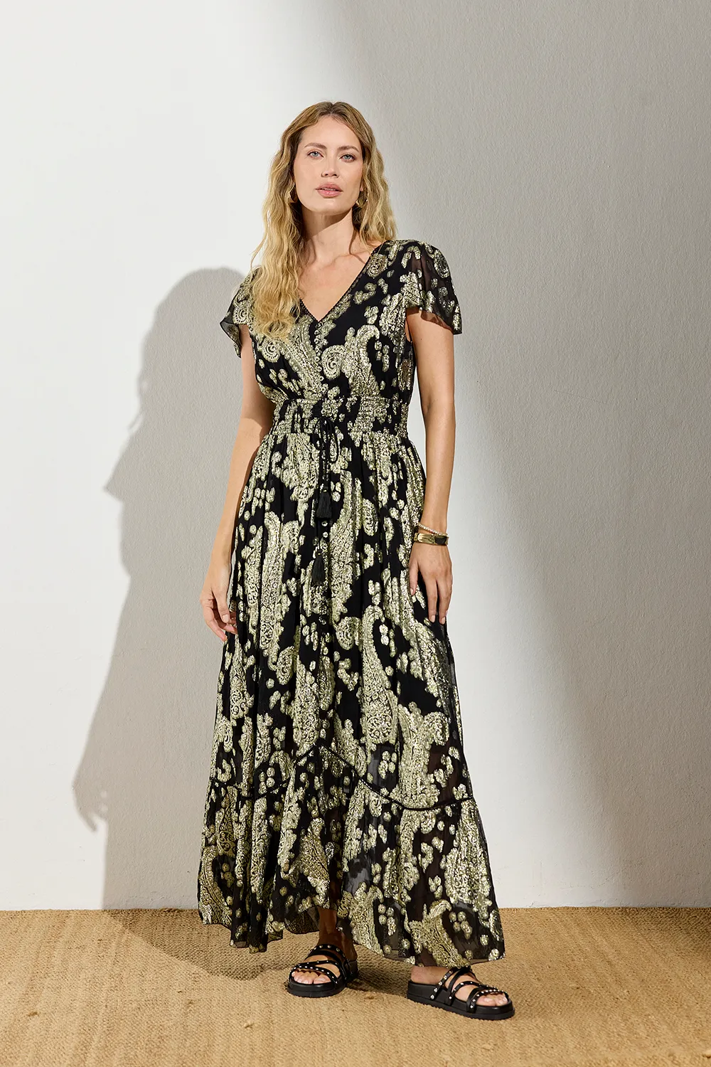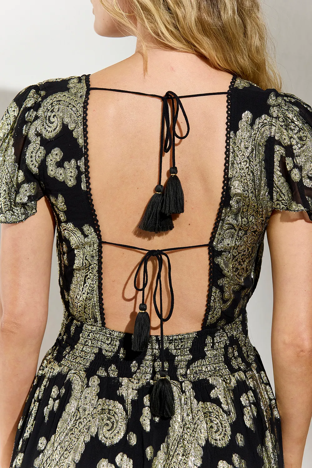 Vestido largo de manga corta bordado con hilo metálico, acabado en escote en v y puntilla, junto a unos delicados botones forrados de su misma tela. Posee una cintura elastizada, entallando el vestido a la cintura y volados en el ruedo, otorgandole mayor vuelo. Su espalda es descubierta y posee lazos a modo de ajuste.