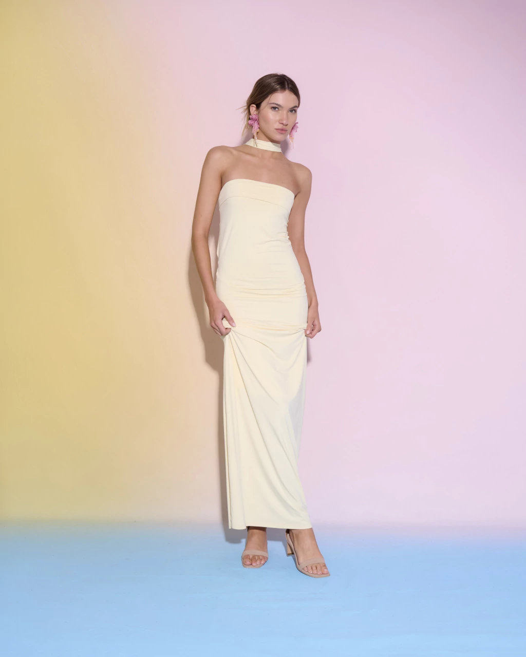 Vestido largo reversible en tricot. Presenta un escote profundo con buche en un lado y diseño strapless en el reverso, permitiendo múltiples formas de uso gracias a sus tiras ajustables. Prenda con alto porcentaje de estiramiento que se adapta al cuerpo con comodidad.