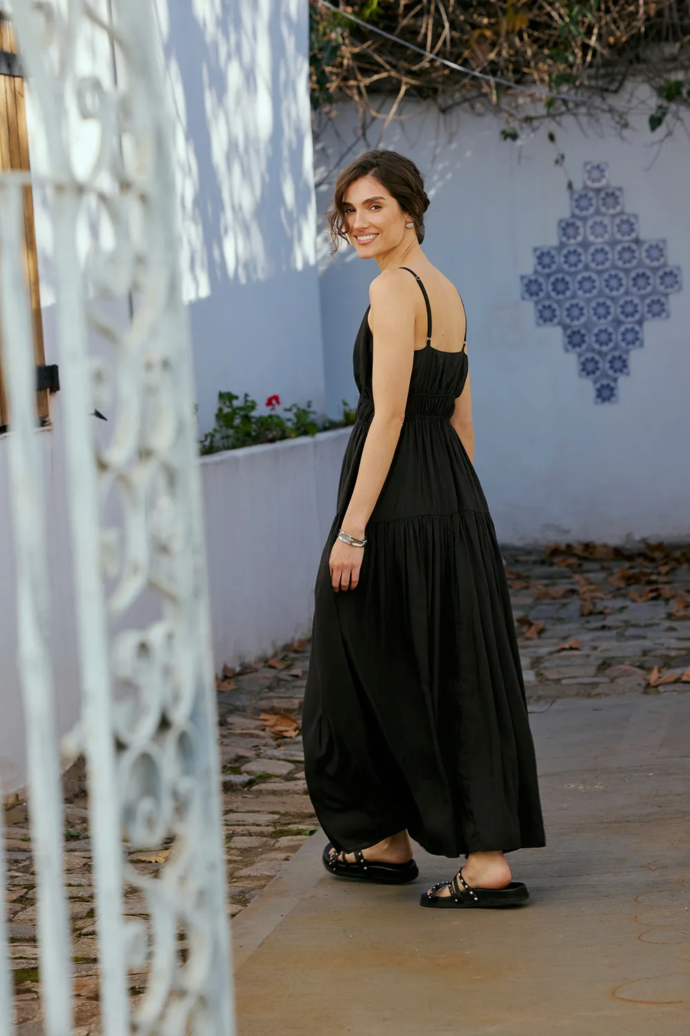 Vestido largo, de corte holgado, sin mangas y ajuste en cintura por medio de elástico. De escote en V y terminación con un delicado volado en su parte inferior lo que le da mayor ligereza y movimiento. Posee unos lazos en la parte delante a modo decorativo.